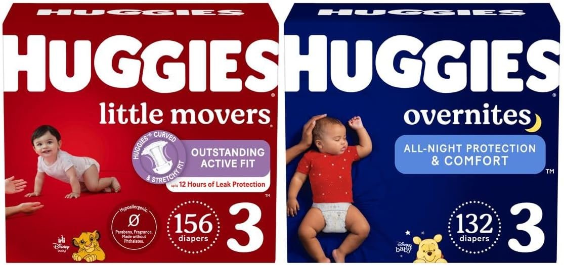 - Bundle includes: Huggies Little Movers Baby Diapers, Size 3 (6 packs of 26, 156 training pants total) & Huggies Overnites Girls’ Overnight Diapers, Size 3 (2 packs of 66, 132 training pants total). Packaging May Vary